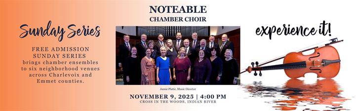Noteable Chamber Choir is giving a free concert at 4 pm on Sunday November 9th at the Cross in the Woods Catholic Shrine in Indian River. Based in Northern Michigan, Noteable consists of 18 skilled and versatile singers showcasing a diverse repertoire ranging from sacred and classical pieces to contemporary works. This program's theme is “Sing For Joy,” and will include music of William Byrd, Morton Lauridsen, Daneil Elder, and more.