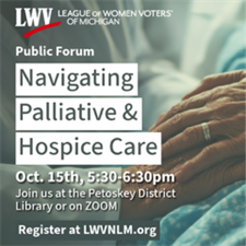 The LWVNLM is presenting a public forum on navigating hospice and palliative care in Northern Michigan. Attend in person at the Petoskey Public Library or by ZOOM to learn from experts, Paul Blanchard, MD, Courntey Brinkman, MS, PNP-C from Northstar Palliative Care and Chris Hurley, LPN from McLaren Health Management Group.